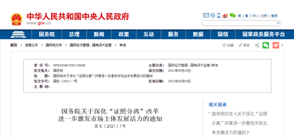 刚刚,中国政 府网发布《国 务院关于深化“证照分离”改革进一步激发市场主体发展活力的通知》。自2021年7月1日起,在全 国范围内实施涉企经营许可事项全覆盖清单管理,按照直接取消审批、审批改为备案、实 -