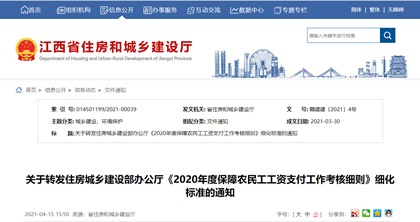 各设区市、省直管县(市)住房和城乡建设局、南昌市城乡建设局、赣江新区城乡建设和交通局:现将住房和城乡建设部办公厅《关于进一步细化<2020年度保障农民工工资支付工作考核细则>相关考核要求的 -