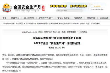 国务院安委会办公室 应急管理部关于开展2021年全 国“安 全生产月”活动的通知安委办〔2021〕5号各省、自治区、直辖市及新疆生产建设兵团安 全生产委员会,国务院安委会各成员单位,各省、自治区、直辖 -