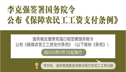 2020年国务院发布《保障农民工工资支付条例》,自5月1日起施行。第二十四条规定:人工费用拨付周期不得超过1个月。第二十八条规定:未订立劳动合同、用工实名登记的人员,不得进入项目现场施工。《条例》正式 -