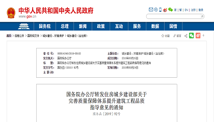 国务院办公厅转发住房城乡建设部关于完善质量保障体系提升建筑工程品质指导意见的通知国办函〔2019〕92号各省、自治区、直辖市人民政府,国务院有关部门:住房城乡建设部《关于完善质量保障体系提升建筑工程品 -