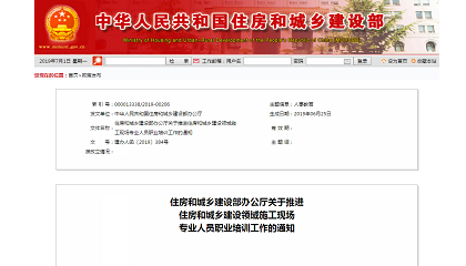 2019年6月25日,住建部官网发布了《关于推进住房和城乡建设领域施工现场专业人员职业培训工作的通知》(建办人函[2019]384号)。八大员职业培训工作正式启动!(文件原文):住房和城乡建设部办公厅 -